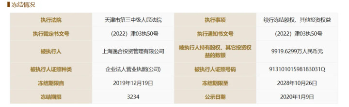 2025年9月份,上海逸合投资管理有限公司(简称“逸合投资”)持有的营口银行4959.82万元股权被司法冻结,冻结期限至2028年9月21日,该笔股权已多次被冻结。此外,该公司持有的营口银行9919.63万元股权2019年12月被冻结,冻结期限至2028年10月26日。