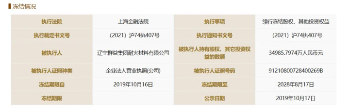 2019年10月份,上海金融法院将营口银行3.50亿元股权冻结,冻结期限至2028年8月17日。该笔股权的持有人为辽宁群益集团耐火材料有限公司(简称“群益集团”)。