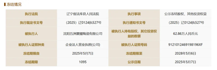 2025年5月份,辽宁省法库县人民法院将营口银行62.86万元股权冻结,冻结期限至2028年5月6日,该笔股权的持有人为沈阳五洲震耀陶瓷有限公司(简称“五洲陶瓷”,现名沈阳五洲陶瓷科技发展有限公司)。此外,该公司持有的营口银行899.01万元股权2025年3月份被冻结,冻结期限至2027年3月5日。