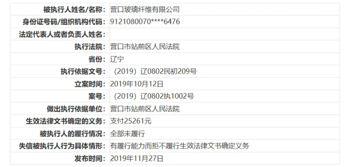 营口银行另一家股东营口玻璃纤维有限公司2019年11月被营口市站前区人民法院列入失信被执行人,涉案总金额仅2.53万元。该公司涉及一起买卖合同纠纷案件,生效法律文书确定的义务为“支付25261元”,履行情况为“全部未履行”,失信被执行人行为具体情形为“有履行能力而拒不履行生效法律文书确定义务”。