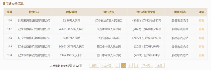 2025年9月份,辽宁金鼎镁矿集团有限公司(简称“金鼎镁矿”)持有的营口银行2.66亿元股权被司法冻结,冻结期限至2028年9月25日,该笔股权已被多家法院轮番冻结。此外,该公司持有的营口银行3000万元股权2022年6月被冻结,冻结期限至2028年5月15日。该公司持有的营口银行1977.59万元股权2021年7月被冻结,冻结期限至2027年6月12日。该公司持有的营口银行1500万元股权2024年1月被冻结,冻结期限至2027年1月15日。该公司持有的营口银行6437.25万元股权2020年9月被冻结,冻结期限至2026年8月30日。