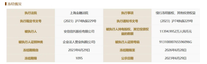 2023年6月份,上海金融法院将营口银行1.14亿元股权冻结,冻结期限至2026年6月28日。该笔股权已四次被法院冻结,被执行人为安信信托股份有限公司。