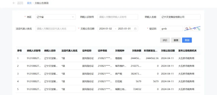 值得注意的是,天宝煤业目前已出现“经营异常”,被国家税务总局大石桥市税务局列入税务非正常户,2024年4月被通报存在5条欠税记录。该公司现存7条失信被执行人信息,涉案总金额8244.13万元。该公司及其法定代表人26次被法院限制高消费,涉案总金额1.82亿元。该公司现存17件终本案件,执行标的总金额1.05亿元,未履行总金额0.99亿元,未履行比例94.43%。