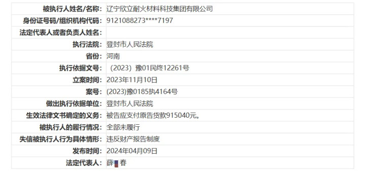营口银行另一家股东欣立科技2024年4月被登封市人民法院列入失信被执行人,涉案总金额仅91.50万元。该公司涉及一起买卖合同纠纷案件,生效法律文书确定的义务为“被告应支付原告货款91.50万元”,履行情况为“全部未履行”,失信被执行人行为具体情形为“违反财产报告制度”。