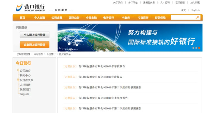 据官网介绍,营口银行成立于1997年4月,总部设于辽宁营口。目前,该行服务网络覆盖营口、沈阳、大连、哈尔滨、葫芦岛、鞍山、丹东、盘锦、本溪、辽阳、阜新、锦州等12个东北地区主要城市,分行数量13家,各级机构总数114家,员工总数近2300人。