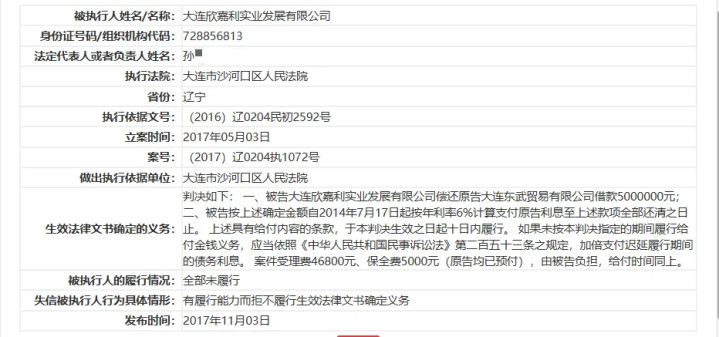 营口银行另一家股东大连欣嘉利2017年11月份被大连市沙河口区人民法院列入失信被执行人,涉案总金额500万元。该公司涉及一起借款合同纠纷案件,生效法律文书确定的义务为“被告偿还原告借款500万元及利息”,履行情况为“全部未履行”,失信被执行人行为具体情形为“有履行能力而拒不履行生效法律文书确定义务”。