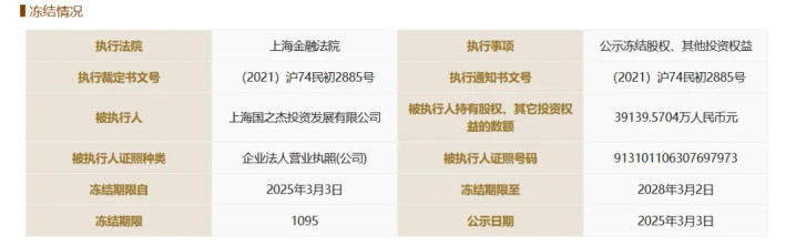 2025年3月份,上海金融法院将营口银行3.91亿元股权冻结,冻结期限至2028年3月2日。该笔股权的持有人为上海国之杰投资发展有限公司。