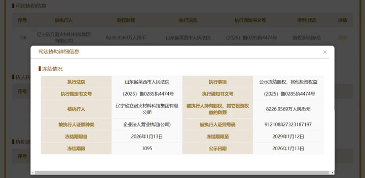 据国家企业信用信息公示系统提供的信息显示,2026年1月13日,营口银行出资额为8226.96万元(下同,股权价值均指出资额)的股权被山东省莱西市人民法院冻结,冻结期限至2029年1月12日。该笔股权的持有人为辽宁欣立耐火材料科技集团有限公司(简称“欣立科技”),执行裁定书文号为(2025)鲁0285执4474号。